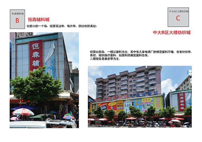 這個是收購了瑞紡改建的比較大的場。算是中大第二大的市場。面料品種比較雜。面料價格都會比國際輕紡城的要便宜一些。大體分為A.B.C.三個區(qū)。共五條街。共三樓。找料子一般在一樓。二樓只有C區(qū)做男裝西裝面料。三樓則為倉庫。(近期收購瑞紡在改造)