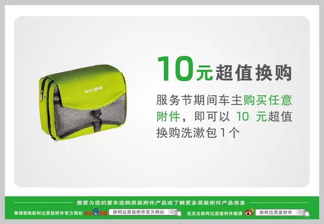 2014斯柯達(dá)服務(wù)節(jié)正在火熱進(jìn)行中!4月20日至5月5日活動期間,在斯柯達(dá)原裝附件在線商城購買任意附件,只需10元即可超值換購洗漱包一個。